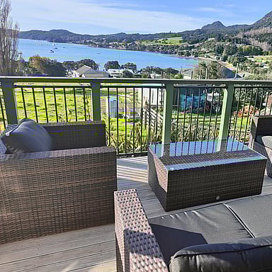 The Manaia suite is our deluxe Queen room with ensuite bathroom. Enjoy expansive views of the bay from your private deck and sunrise over Mount Manaia from your bed.